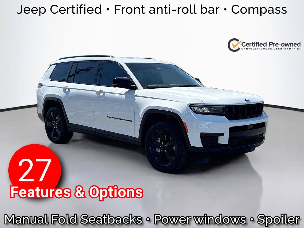125-Point Chrysler Jeep Dodge Ram Certified Inspection, Multi-Point Inspection, w/ Oil Change, Smog Completed, & Full Vehicle Detail Insided & Out, Wiper Blades are New all around, Cabin Air Filter is New, Engine Air Filter is New, Certified Pre-Owned Gold Certified, 115V Auxiliary Power Outlet, 180 Amp Alternator, 3.45 Rear Axle Ratio, 3rd Row Charge-Only USB Ports, 3rd row seats: split-bench, 4-Wheel Disc Brakes, 6 Speakers, 7 and 4 Pin Wiring Harness, ABS brakes, Air Conditioning, Alloy wheels, Altitude X, AM/FM radio: SiriusXM, Anti-whiplash front head restraints, Automatic Headlamp Leveling System, Automatic temperature control, Black Headliner, Brake assist, Bumpers: body-color, Capri Leatherette/Suede Seats, Class IV Receiver Hitch, Cloth Seats, Compass, Delay-off headlights, Delete Laredo Badge, Driver door bin, Driver vanity mirror, Dual Exhaust Tips, Dual front impact airbags, Dual front side impact airbags, Electronic Stability Control, Emergency communication system, Four wheel independent suspension, Front anti-roll bar, Front Bucket Seats, Front Center Armrest w/Storage, Front dual zone A/C, Front License Plate Bracket, Front reading lights, Fully automatic headlights, Gloss Black Exterior Accents, Heated door mirrors, Heated Front Seats, Heated Steering Wheel, Heavy-Duty Engine Cooling, Illuminated entry, Knee airbag, Low tire pressure warning, Manual Fold Seatbacks, Model Year Tracking, Normal Duty Suspension, Occupant sensing airbag, Outside temperature display, Overhead airbag, Overhead console, Panic alarm, ParkView Rear Back-Up Camera, Passenger door bin, Passenger vanity mirror, Power door mirrors, Power driver seat, Power Liftgate, Power steering, Power Sunroof, Power windows, Quick Order Package 23M Altitude X, Radio data system, Radio: Uconnect 5 with 8.4" Display, Rain Sensitive Windshield Wipers, Rear air conditioning, Rear anti-roll bar, Rear Load Leveling Suspension, Rear reading lights, Rear window defroster, Rear window wiper, Reclining 3rd row seat, Remote keyless entry, Remote Start System, Security system, Selectable Tire Fill Alert, Speed control, Speed-Sensitive Wipers, Split folding rear seat, Spoiler, Steering wheel mounted audio controls, Tachometer, Telescoping steering wheel, Tilt steering wheel, Traction control, Trailer Hitch Zoom, Trailer Tow Package, Trip computer, Variably intermittent wipers, Voltmeter, Wheels: 20" x 8.5" Gloss Black Painted Aluminum, Wireless Charging Pad.